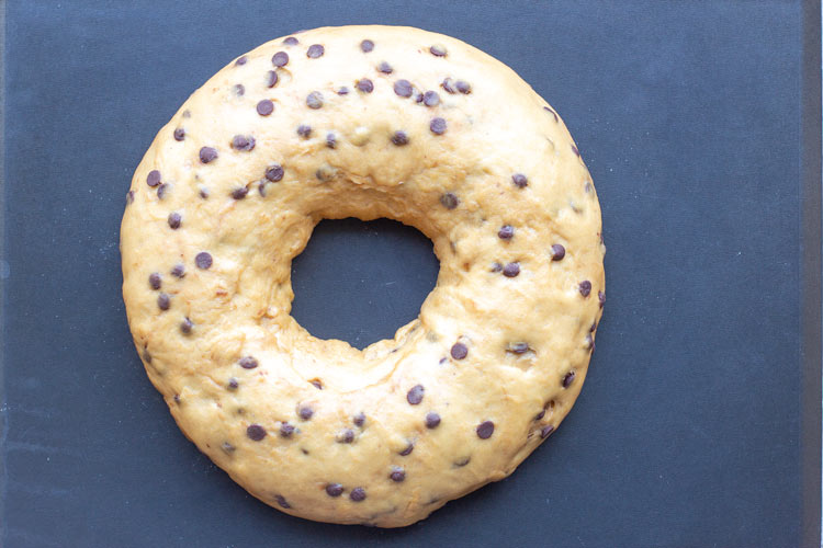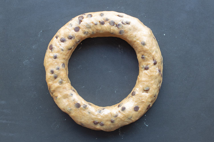 - Placez la pâte sur le plan de travail. Étalez-la en un grand rectangle, saupoudrez de 100 g de pépites de chocolat, puis rassemblez la pâte en boudin en pétrissant un peu à la main pour bien intégrer et répartir les pépites. Formez un long boudin, placez la fève plus ou moins au milieu, puis roulez encore le boudin de pâte pour l'allonger, puis refermez-le pour former une couronne. Le trou au milieu doit faire environ 12 cm. Humidifiez avec quelques gouttes d'eau pour bien sceller la soudure.
