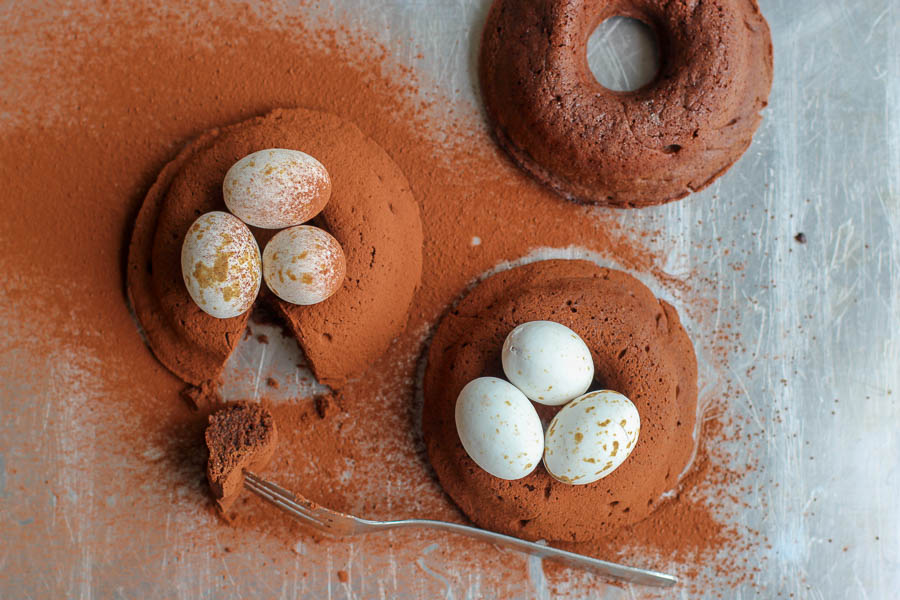 La V1 avait été réalisée une année où j’étais totalement “à l’arrache”, avec à peine 10 minutes pour bricoler un dessert de Pâques. Je m’étais décidée à partager malgré tout mon idée, en me disant que ça pourrait dépanner d’autres personnes très très pressées. Avec à la clé un petit exercice de développement personnel, en mode “lâcher prise et lutte contre le perfectionnisme”. L’idée en question consistait à réaliser des moelleux au chocolat dans un moule à donuts ou à savarin, à les saupoudrer de cacao et à y déposer quelques petits oeufs de Pâques. Basique.