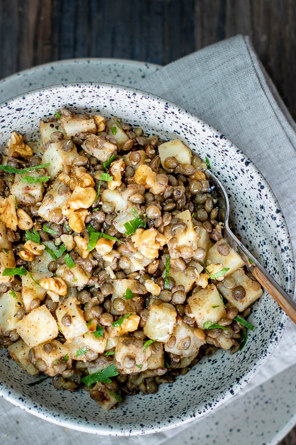 Enfin et surtout : le goût ! Vous serez probablement surpris du plaisir que vous prendrez à manger cette salade. Les notes de noisettes et la mâche des lentilles vertes, le côté fondant et presque sucré du céleri-rave cuit, le croquant des noix et la fraicheur de la menthe* : tout ça contribue à faire de cette recette sans prétention un plat fort agréable.